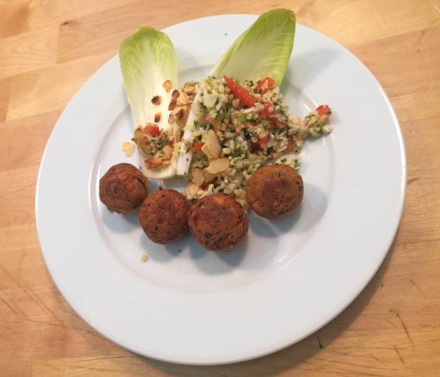 Diesmal gab es knusprige Dinkellaibchen mit einer schnellen Joghurtsauce. Guten Appetit!